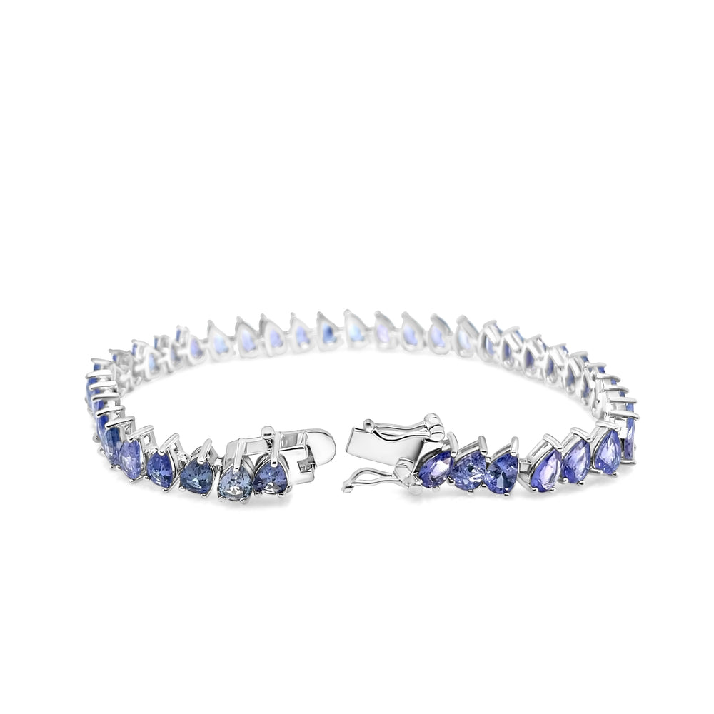 This tennis bracelet features 6x4 mm pear-shaped Tanzanite stones, totaling 18.83 carats, set in 925 WR metal. With its sleek design and vibrant blue stones, this bracelet exudes luxury and sophistication. Weighing 10.03 grams, it is the perfect accessory for both casual and formal occasions, offering a modern take on a classic style.