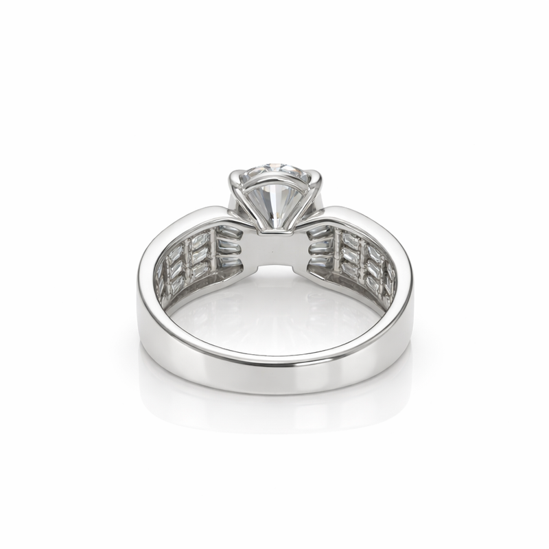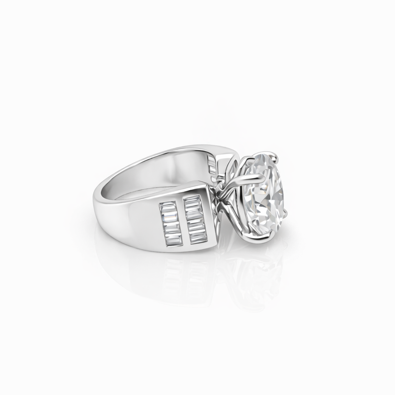 Refined 8.45-carat DEW Moissanite ring in 925 Platinum plating features lab-grown stones with dazzling clarity. Ethical and lightweight, perfect for gifting or elevating personal style.