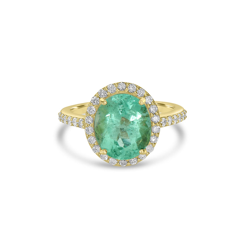 This ring features a 4.35 carat Colombian emerald surrounded by white diamonds, set in 14K yellow gold. The design is clean and elegant, offering a balanced look that works well for daily wear as well as special occasions.