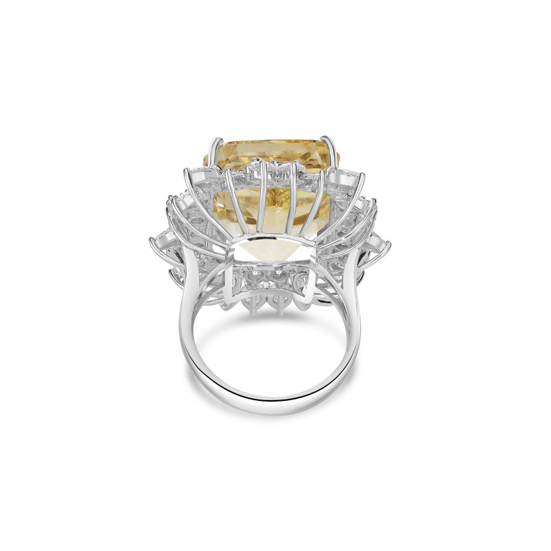 This ring features a 41.33 carat yellow sapphire accented with white diamonds, set in 18K white gold. The bright sapphire color and clean design give the ring a striking and luxurious presence.