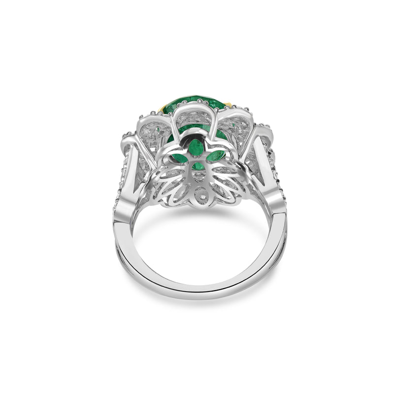 This ring features a 7.71 carat emerald accented by white diamonds. Crafted in 18K two tone gold, it offers a balanced and polished look that feels both traditional and modern at the same time.