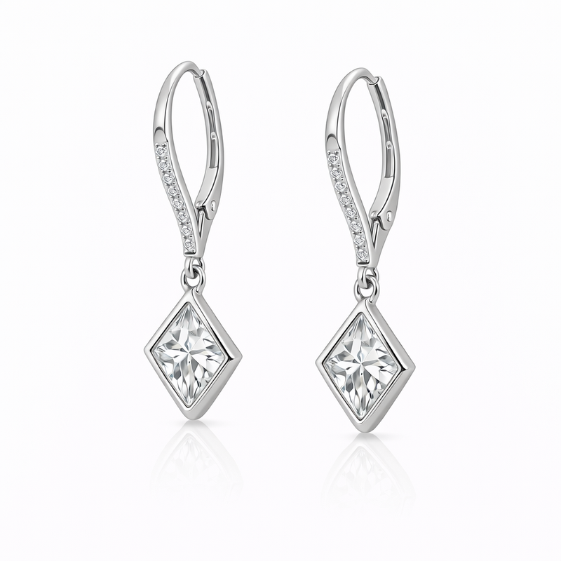 Refined elegance shines with 3.85 cts Moissanite dangle earrings in 925 Platinum plating. Lightweight, modern and versatile for day to evening wear.