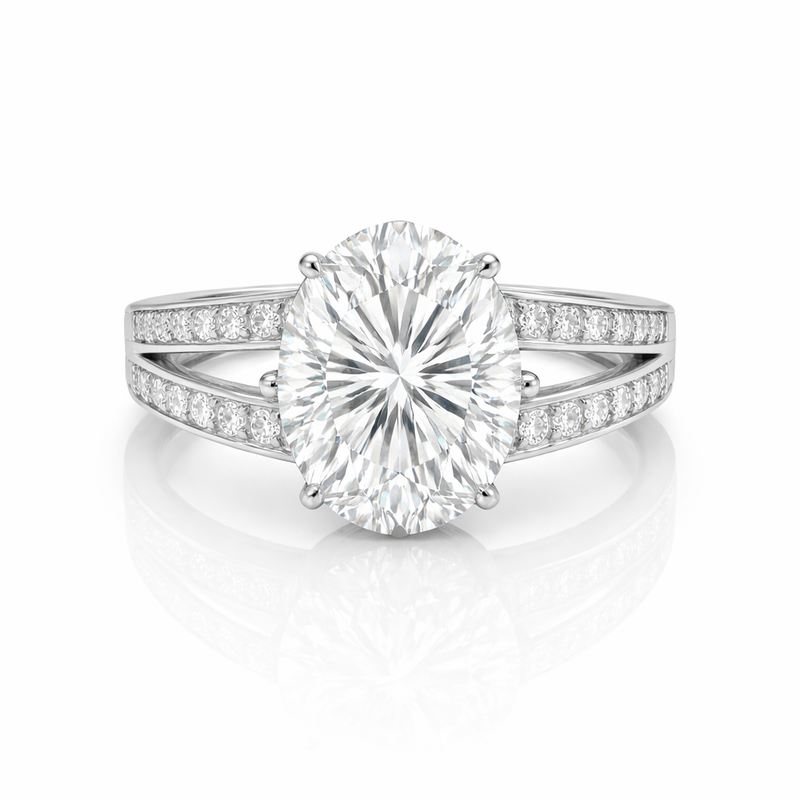 Refined 5.80-carat DEW Moissanite ring in 925 Platinum plating showcases lab-created stones with brilliant sparkle. Lightweight, ethical, and stylish for both casual and formal occasions.