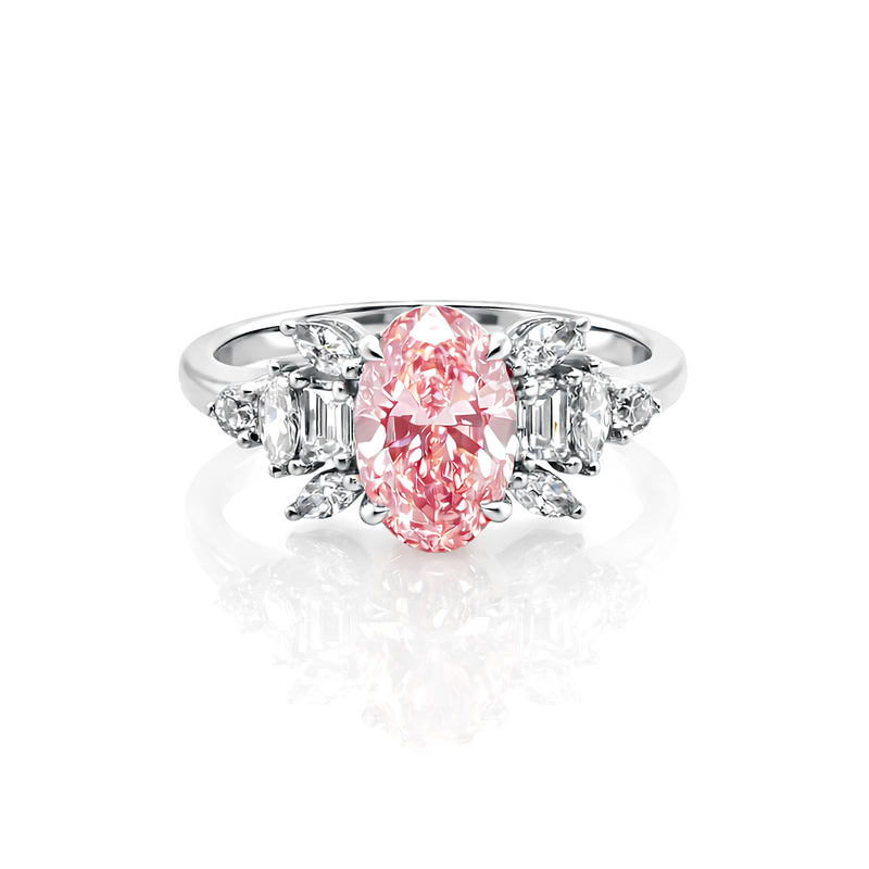This elegant ring features a soft pink lab grown diamond beautifully accented with sparkling white lab grown diamonds. Set in polished 14K white gold, the design offers a refined balance of modern luxury and timeless charm, perfect for engagements or special milestones.