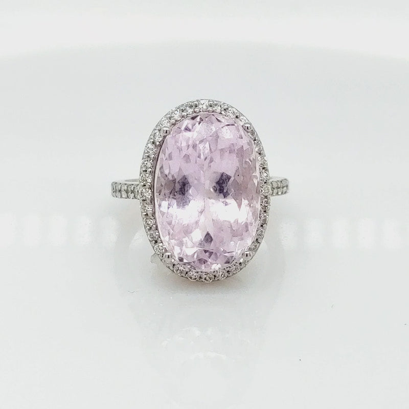 Soft pastel Kunzite paired with white diamonds in 14K Two-Tone Gold, creating a sophisticated and versatile ring suitable for everyday charm or special occasions.