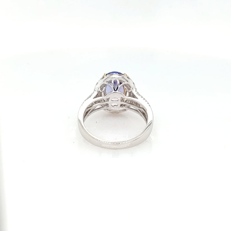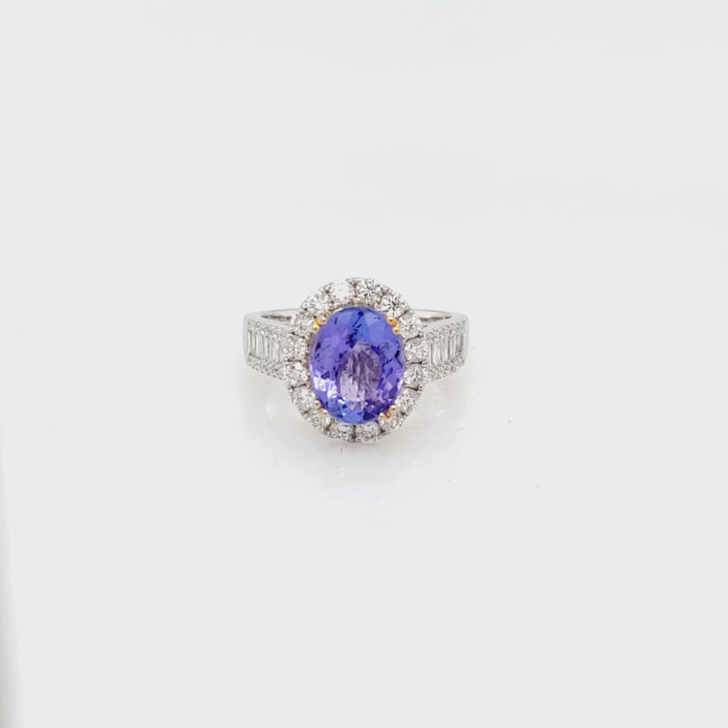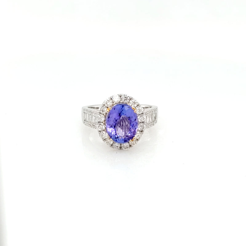 Striking Tanzanite with white diamonds in 14K Two-Tone Gold, a sophisticated ring that enhances any look with subtle elegance.