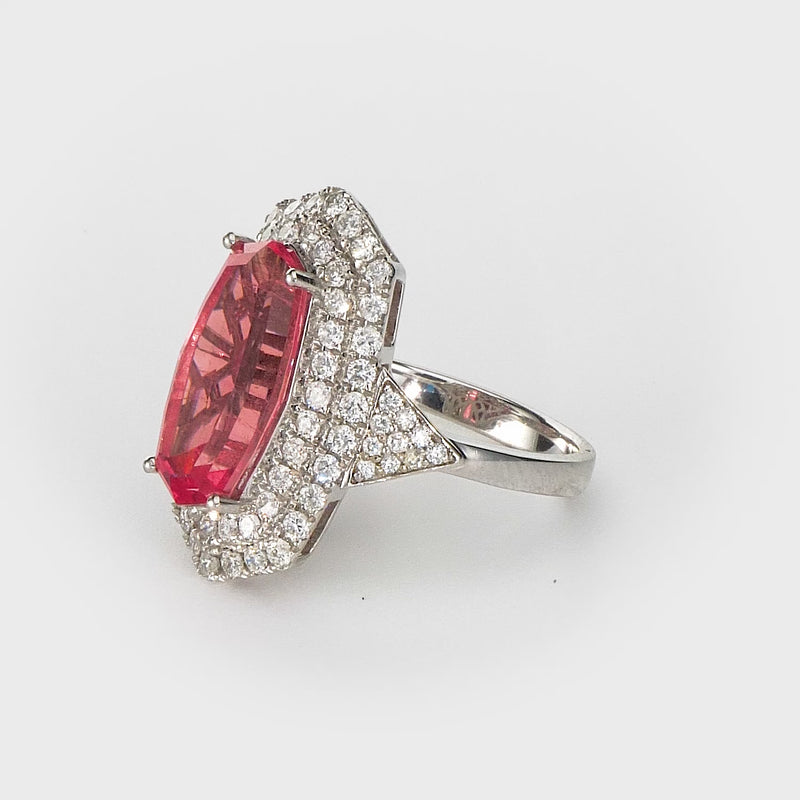 This ring features a 6.2 carat rhodochrosite accented with white diamonds, crafted in 14K white gold. It offers a timeless look that works well for both special occasions and refined daily wear.