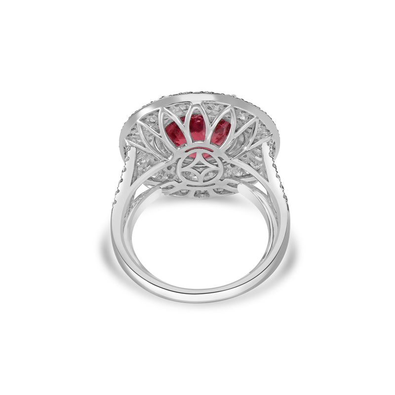 This ring showcases a 7.8 carat rhodochrosite accented with white diamonds, crafted in 18K two tone. The polished setting enhances the stone’s beauty and gives the ring a premium and timeless appearance.