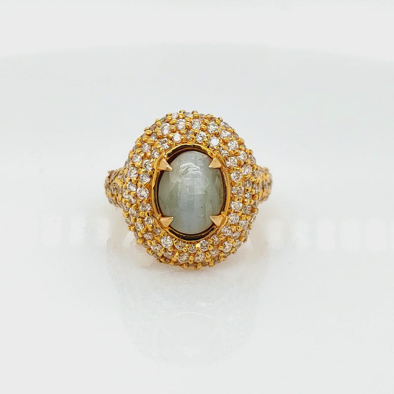 Elegant Chrysoberyl with white diamonds in 14K Yellow Gold, a versatile ring that brings sophistication and charm to any ensemble.