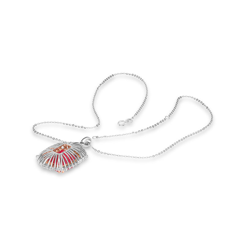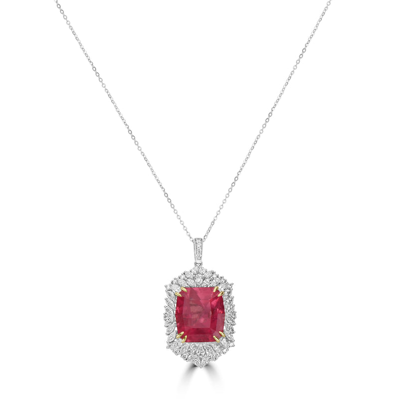 This pendant features a 19.85 carat rhodochrosite accented with white diamonds, crafted in 18K two tone gold. The soft pink tone of the stone gives it a warm and elegant feel, suitable for both casual and formal wear.