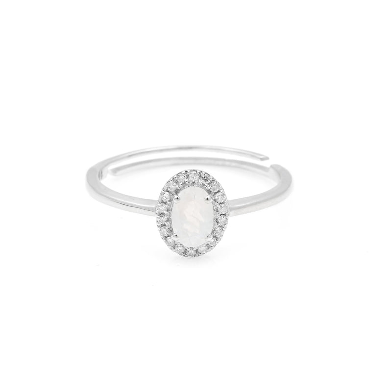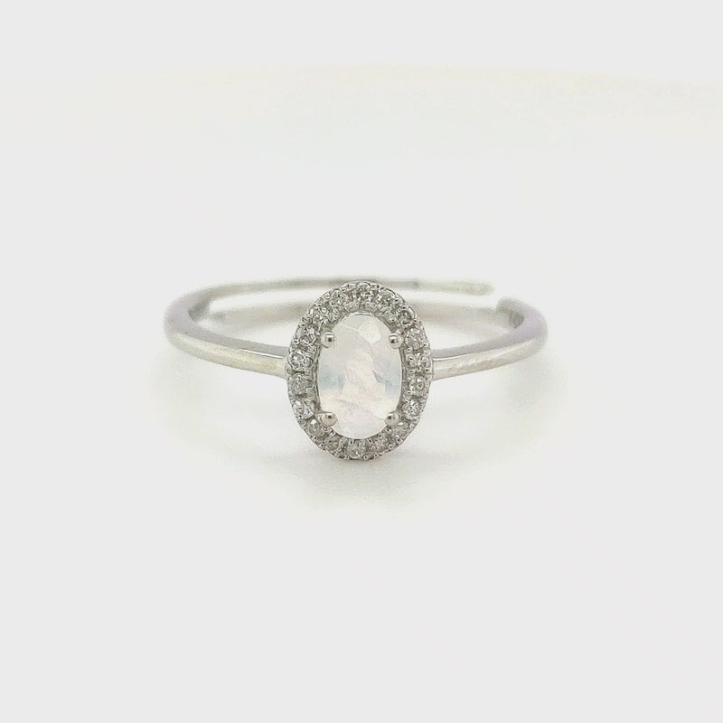 Rainbow Moonstone paired with white diamonds in 14K White Gold, a ring with ethereal elegance and subtle shine.
